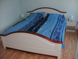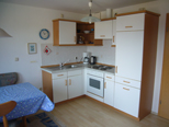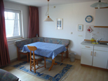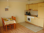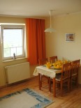 Die Wohnung im ersten Obergeschoss verfügt außerdem über einen Geschirrspüler, einen Balkon und ist im Landhausstil eingerichtet. Weiterhin sind in beiden Wohnungen Toaster, Wasserkocher und Kaffeemaschine, Geschirr und weitere wichtige Küchenutensilien vorhanden. Spülmittel, Flüssigseife, Filtertüten, Salz, Zucker, Pfeffer und Toilettenpapier werden ebenfalls zur Verfügung gestellt. Bettwäsche und Hand-/Badetücher müssen mitgebracht oder können gegen Gebühr angemietet werden.